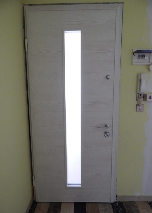 Porta d’ingresso blindata con un vetro centrale antisfondamento, completa di paraspifferi e limitatore di apertura.