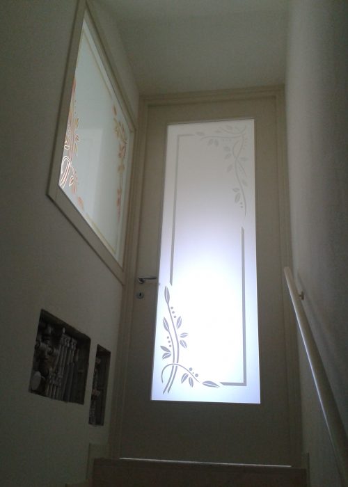 Porta interna liscia laccata, con vetro satinato e decoro sabbiato, abbinato al lucernario fisso.