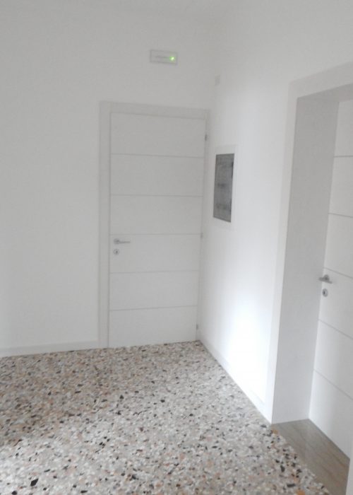 Porte interne modello K in Frassino Country con inserti in alluminio anodizzato, personalizzabili nel numero e nella dimensione, qui con casse alla trentina e cerniere tradizionali.